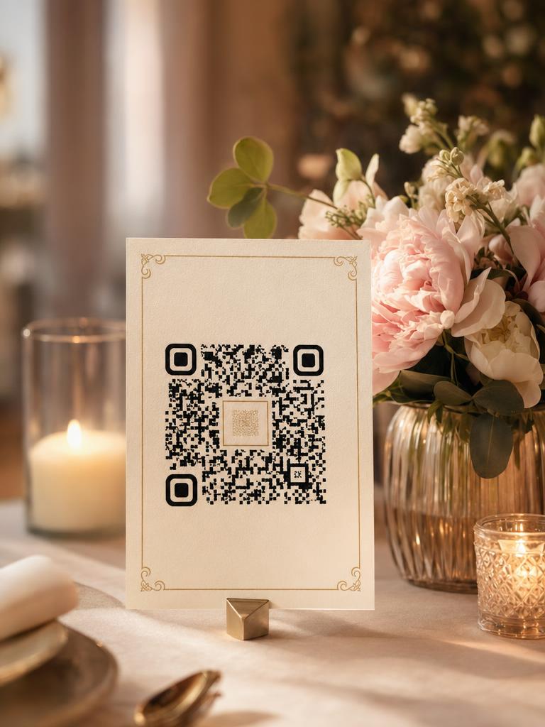 Display your unique QR code at the event. Guests scan and instantly access your branded upload page — no app required.