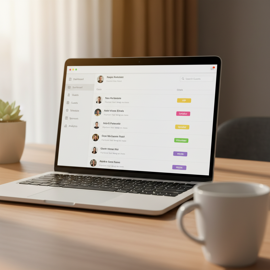Tags are free-form colored labels you attach to guests. Create as many as you need (up to 50 per event): "Family", "VIP", "Instagram", "Work", "Dietary-veg", "Flying in". Tags let you: