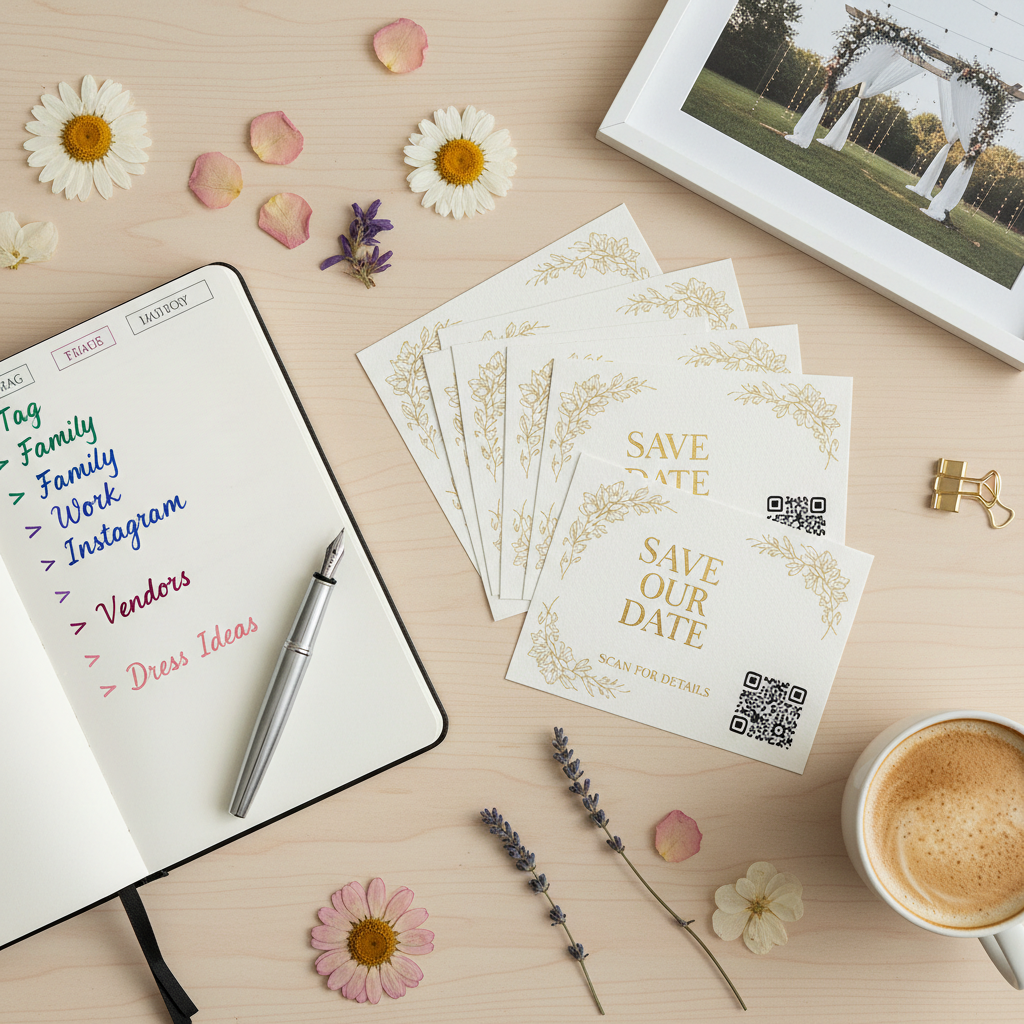 - Printed save-the-date cards with a QR code